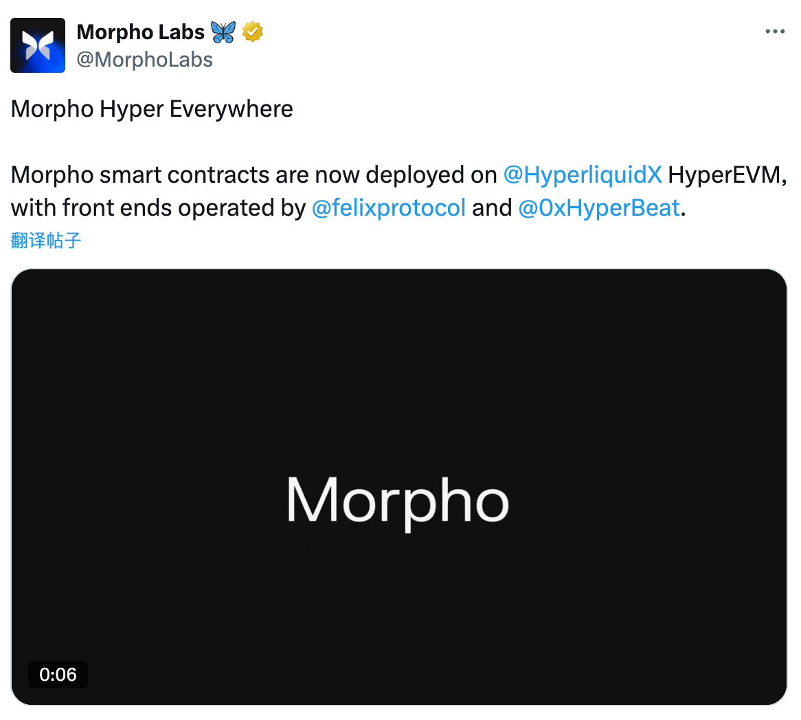 Morpho 的智能合约现已部署到 Hyperliquid 的 HyperEVM 上